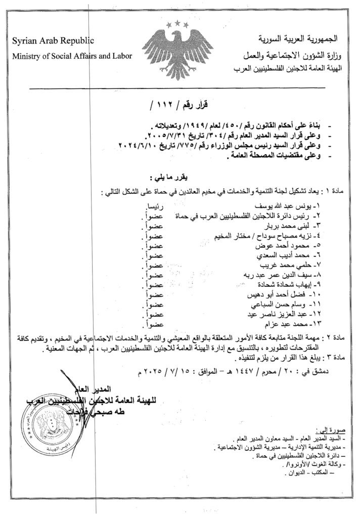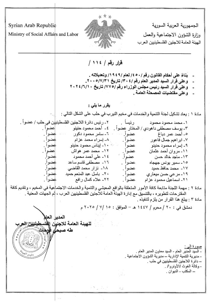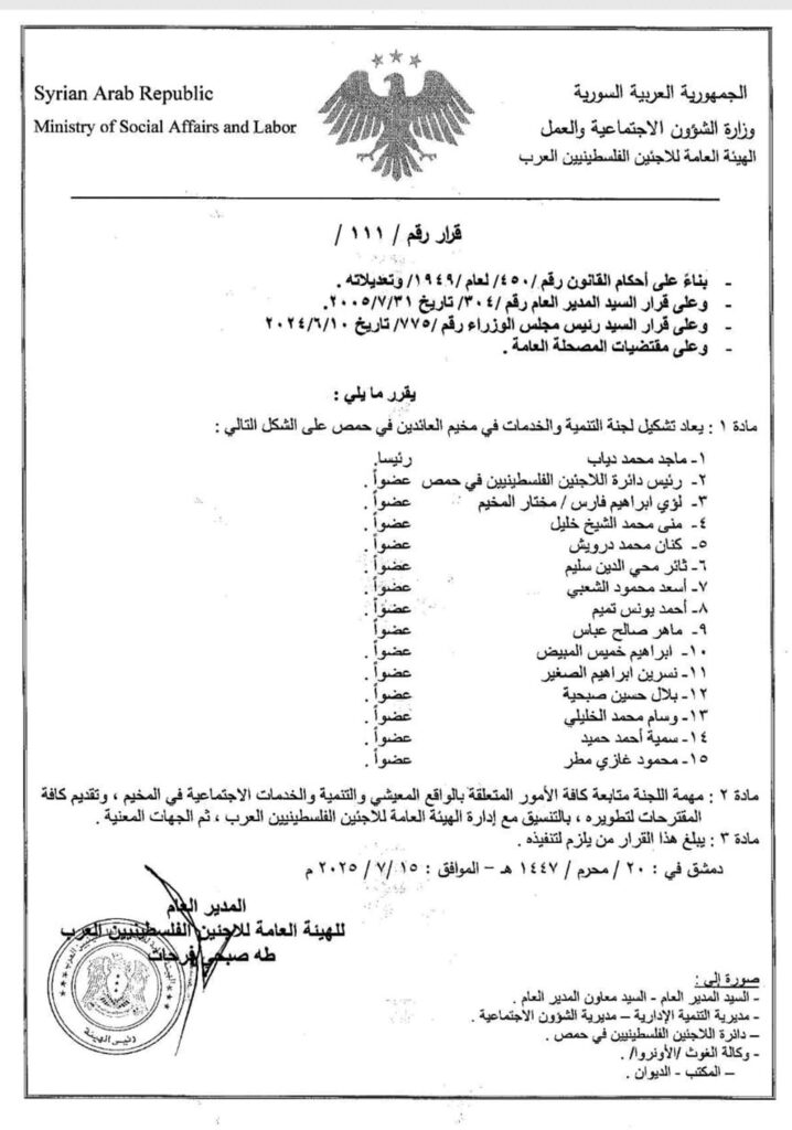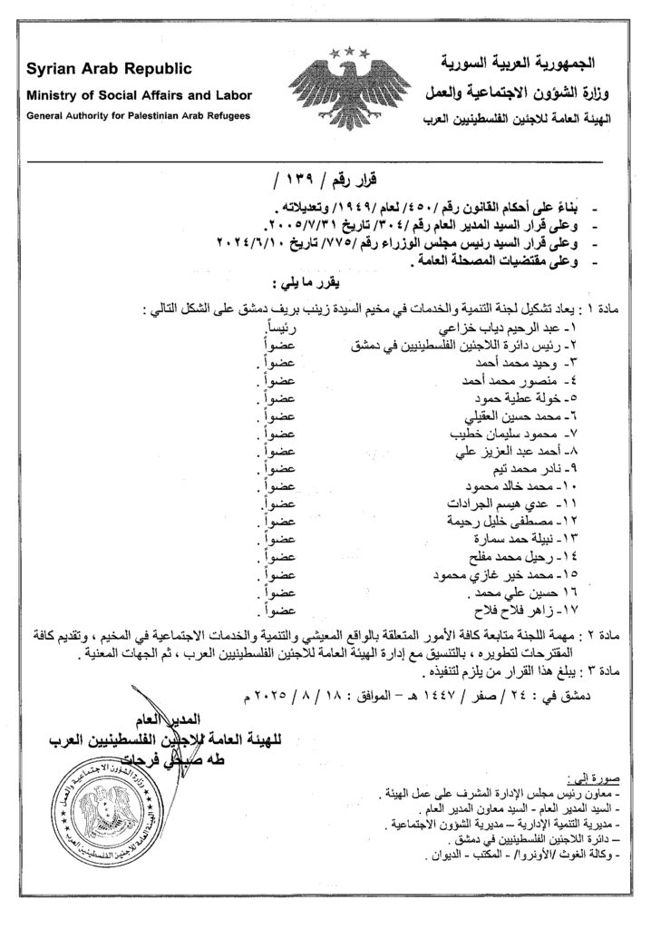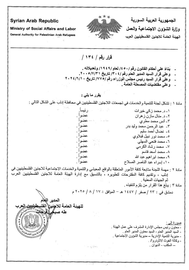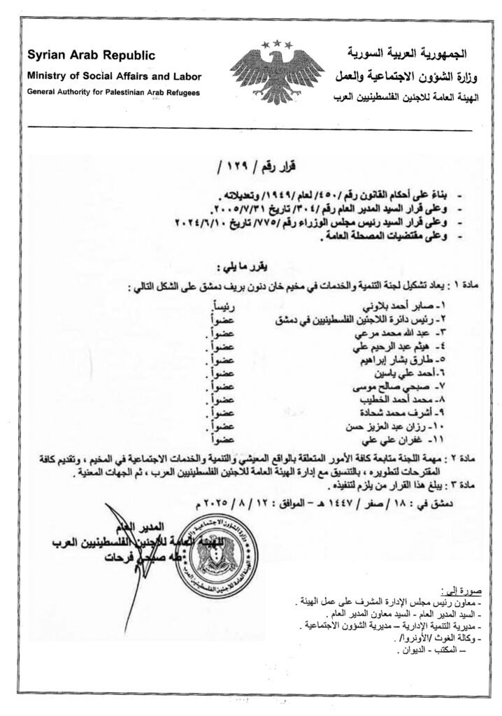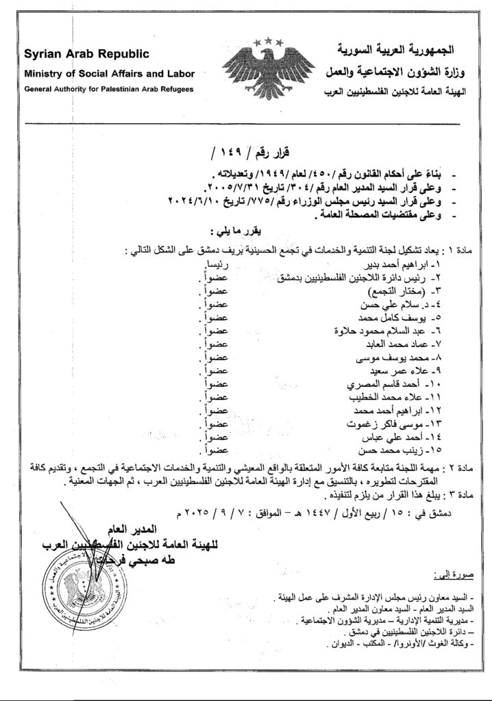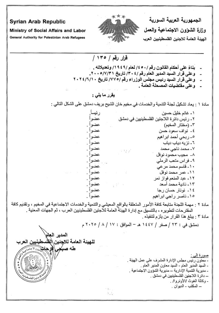 الهيئة العامة للاجئين الفلسطينيين العرب تشكّل لجان التنمية والخدمات في المخيمات والتجمعات الفلسطينية بسوريا