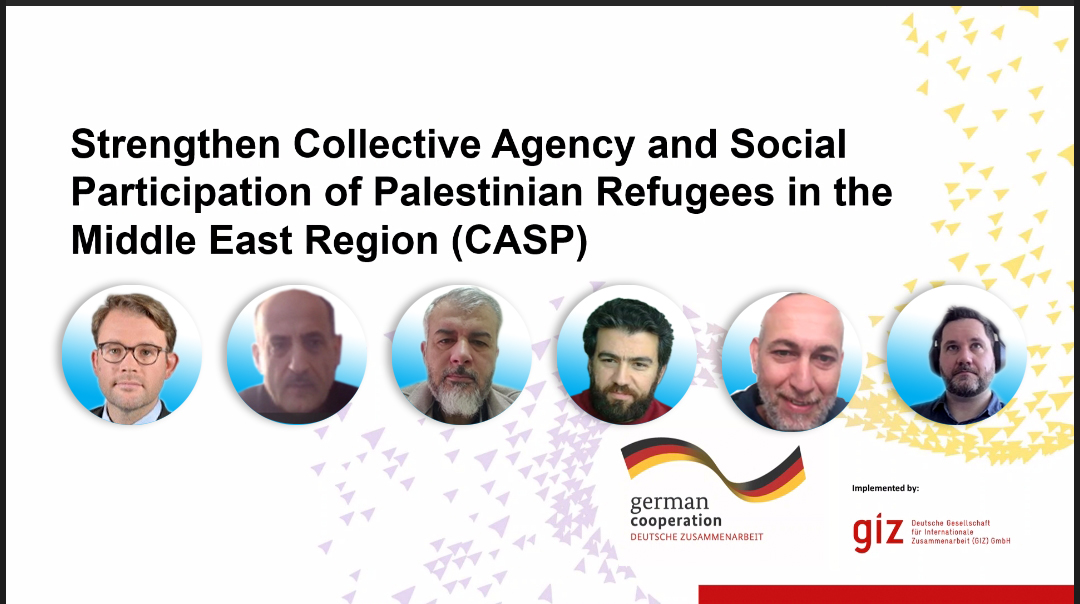 عُقد صباح يوم الخميس 12 آذار/مارس 2026 لقاء افتراضي عبر تقنية الاتصال المرئي بين الهيئة العامة للاجئين الفلسطينيين العرب و الوكالة الألمانية للتعاون الدولي GIZ ، خُصِّص لبحث آفاق التعاون المشترك في إطار مشروع CASP الهادف إلى تعزيز مشاركة اللاجئين الفلسطينيين في القضايا المجتمعية والتنموية.